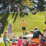 So just imagine a big hill, lots of trees, tons of seating, equipment strewn around in shaded areas, and beautiful sculptures. That’s a Harper’s playground. And maybe most importantly, lots of people engaged in joyful play. (Janet: right). Because our spaces are pretty awesome, but they’re, what makes them most awesome is the people that inhabit them. (Janet: right). That’s what enlivens the space, and I think the draw is not the space so much as the experience people are going to have when they’re there.