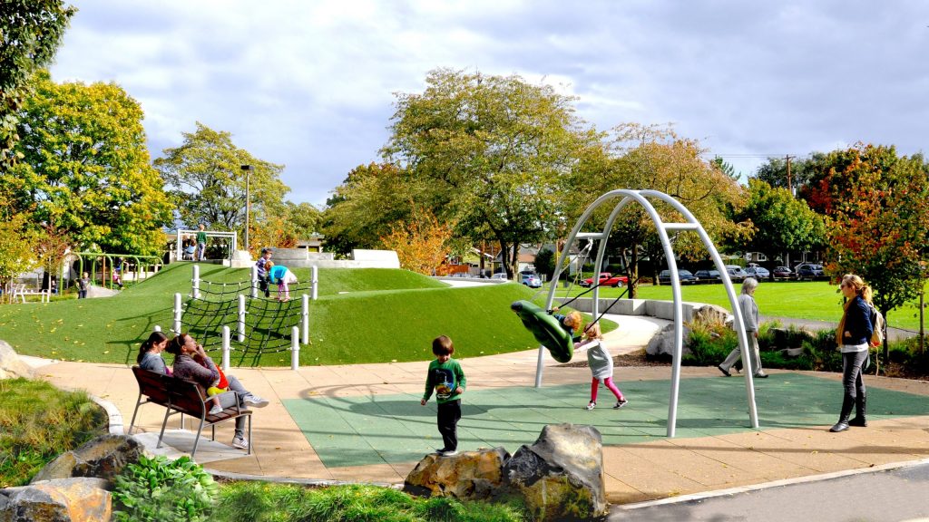 Playgrounds primarily shouldn’t just exist all by themselves. Ideally, they should be part of a larger park ecosystem with a nice rolling path that leads to other amenities. We want the families that come to our playgrounds to be able to have that be part of, of a joyous experience that includes other things. And maybe there’s other family members that like to do different things. So, it’s an entire ecosystem. (Janet: right).